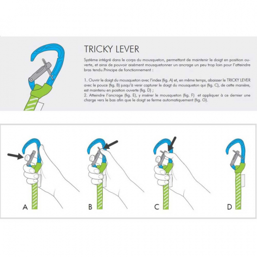 Le système auxiliaire Tricky Lever consiste en une patte intégrée dans le corps du mousqueton. Cette technologie permet de maintenir le doigt du mousqueton ouvert lors de la mise en place dans le point d’ancrage et de se refermer automatiquement en appliquant une force vers le bas. De plus, le mousqueton dispose du système de fermeture Catch Free pour éviter les problèmes d’accrochage.