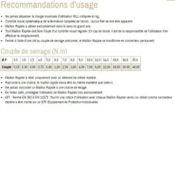 - Tout Maillon Rapide doit faire l'objet d'un contrôle visuel régulier. En cas de doute, il est de la responsabilité de l'utilisateur d'en effectuer le remplacement.